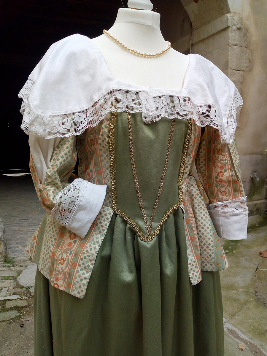 - Robe vert pale à basque en coton à motifs imprimés et galons dorés